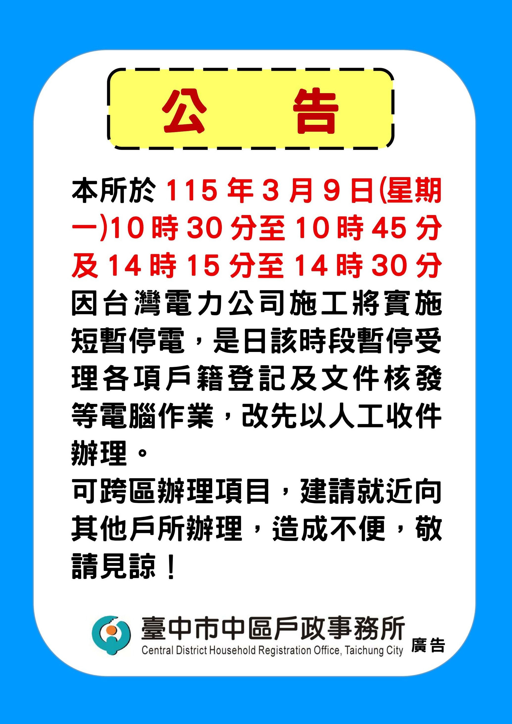 本所於115年3月9日(星期一)10時30分至10時45分及14時15分至14時30分因台灣電力公司施工將實施短暫停電,是日該時段暫停受理各項戶籍登記及文件核發等電腦作業,改先以人工收件辦理。